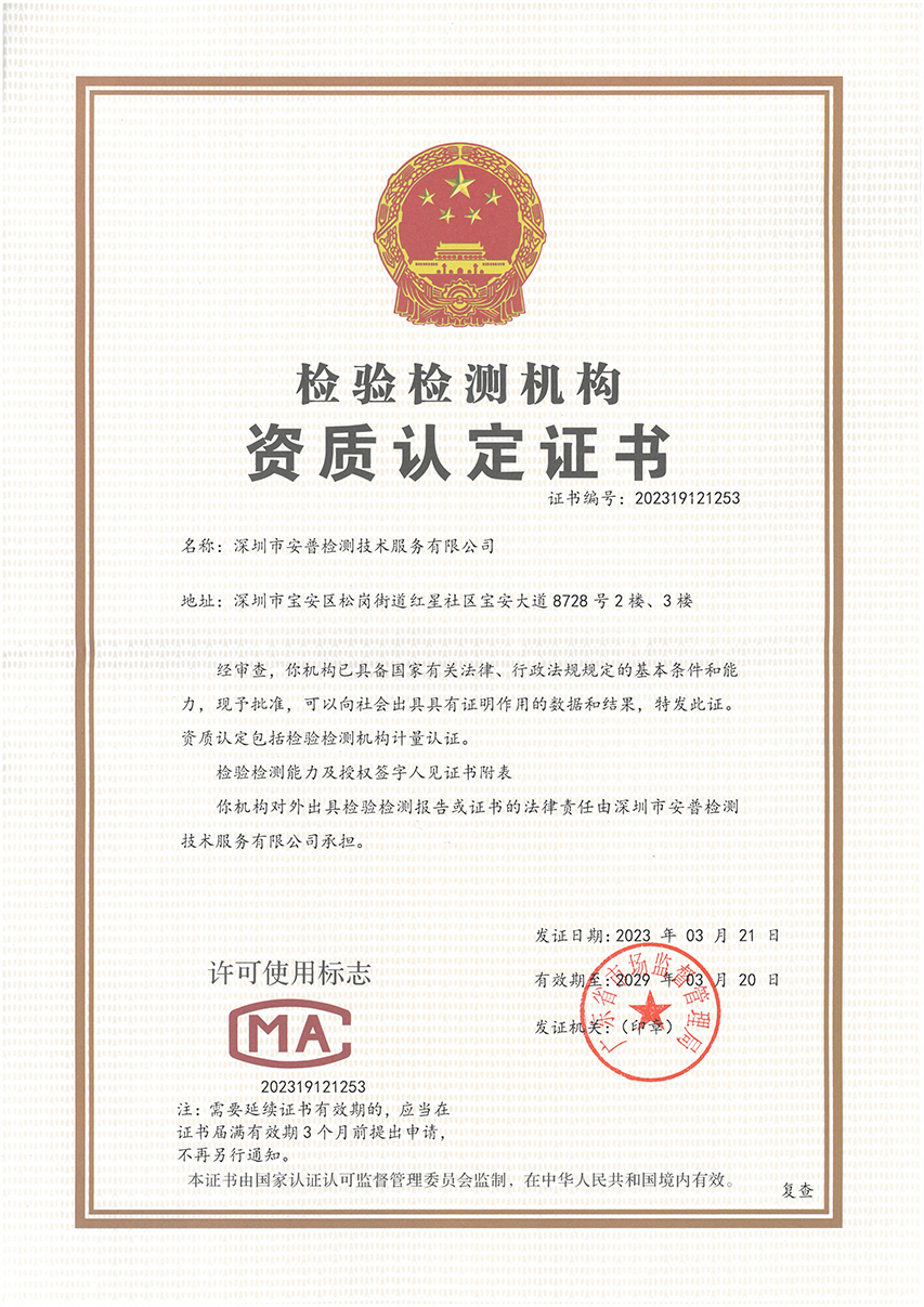 深圳安普檢測成立于2013年6月,已獲得CMAS、CNAS和高新技術企業稱號,能依據GB、ISO、EN、DIN、ASTM、JIS、IEC等標準在金屬材料、焊接產品、涂鍍產品、倉儲貨架、無損探傷、高分子以及復合材料等領域提供專業的檢測服務。